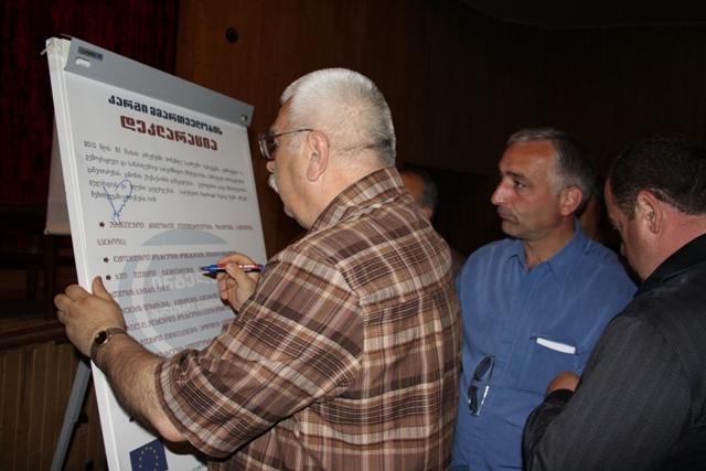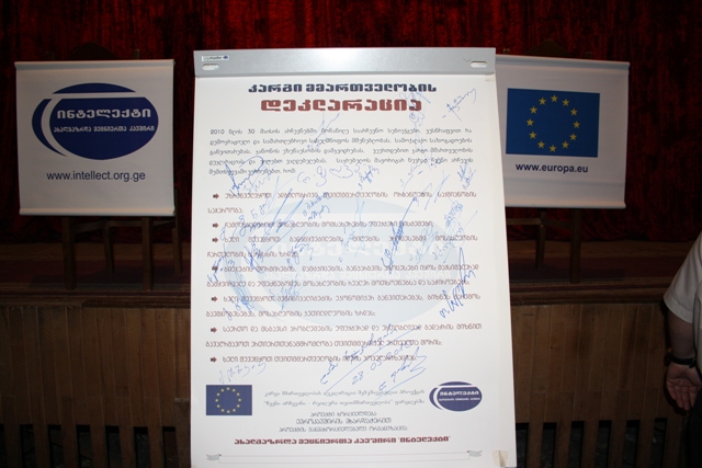 áƒáƒ ჩევნებáƒáƒ›áƒ“ე áƒáƒ ი დღით áƒáƒ“რე, 28 მáƒáƒ˜áƒ¡áƒ¡ áƒáƒáƒáƒ ის ხუთ მუნიციპáƒáƒšáƒ˜áƒ¢áƒ”ტში (ხულáƒ, შუáƒáƒ®áƒ”ვი, ქედáƒ, ხელვáƒáƒ©áƒáƒ£áƒ ი, ქáƒáƒ‘ულეთი) "ინტელექტის" წáƒáƒ მáƒáƒ›áƒáƒ“გენლები სáƒáƒ™áƒ ებულáƒáƒ¡ მáƒáƒŸáƒáƒ იტáƒáƒ áƒáƒ‘ის კáƒáƒœáƒ“იდáƒáƒ¢áƒ”ბს შეხვდნენ დრ"კáƒáƒ გი მმáƒáƒ თველáƒáƒ‘ის დეკლáƒáƒ áƒáƒªáƒ˜áƒ" წáƒáƒ უდგინეს. სáƒáƒ™áƒ ებულáƒáƒ¨áƒ˜ მáƒáƒ¡áƒ•ლის მსურველებმრდეკლáƒáƒ áƒáƒªáƒ˜áƒ მáƒáƒ˜áƒ¬áƒáƒœáƒ”ს დრმáƒáƒ¡ სáƒáƒ¯áƒáƒ áƒáƒ“ ხელი მáƒáƒáƒ¬áƒ”რეს. "დეკლáƒáƒ áƒáƒªáƒ˜áƒ˜áƒ¡" პრინციპებს მხáƒáƒ ს ვუáƒáƒ”რთ. დáƒáƒ წმუნებული ვáƒáƒ , რáƒáƒ› კáƒáƒœáƒ“იდáƒáƒ¢áƒ”ბი, რáƒáƒ›áƒšáƒ”ბმáƒáƒª ხელი მáƒáƒáƒ¬áƒ”რეს დეკლáƒáƒ áƒáƒªáƒ˜áƒáƒ¡ დრრáƒáƒ›áƒšáƒ”ბიც "áƒáƒšáƒ˜áƒáƒœáƒ¡áƒ˜ სáƒáƒ¥áƒáƒ თველáƒáƒ¡áƒ—ვის" მáƒáƒŸáƒáƒ იტáƒáƒ ები áƒáƒ იáƒáƒœ, სáƒáƒ™áƒ ებულáƒáƒ¨áƒ˜ მáƒáƒ¡áƒ•ლის შემთხვევáƒáƒ¨áƒ˜ გáƒáƒ˜áƒ—ვáƒáƒšáƒ˜áƒ¡áƒ¬áƒ˜áƒœáƒ”ბენ áƒáƒ› პრინციპებს. – გáƒáƒœáƒáƒªáƒ®áƒáƒ“რ"áƒáƒšáƒ˜áƒáƒœáƒ¡áƒ˜ სáƒáƒ¥áƒáƒ თველáƒáƒ¡áƒ—ვის" მáƒáƒŸáƒáƒ იტáƒáƒ áƒáƒ‘ის კáƒáƒœáƒ“იდáƒáƒ¢áƒ›áƒ ივერი გუგუნáƒáƒ•áƒáƒ›.
